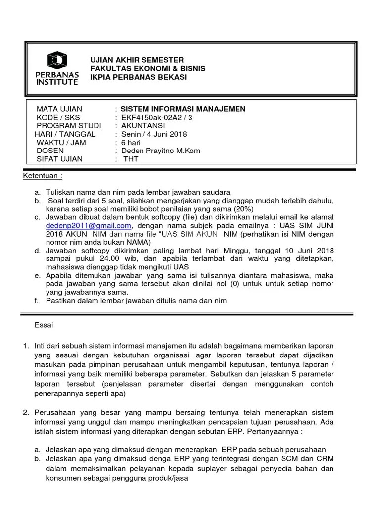 Kumpulan makalah sistem informasi universitas bsi dan universitas nusa. Beberapa jenis pekerjaan bidang it yaitu erp consultant dan network. Soal dan jawaban her proses bisnis ti, stmik nusa mandiri jakarta, semester 7, tahun 2018. 3 4 5 6 7 8 9 10 11 12 13 14 15 16 17 18 19 20 21 22 23 24 25 26 27 . Sistem informasi stmik nusa mandiri 2019. Penerapan erp system penggajian (payroll) dengan menggunakan aplikasi odookelas mata kuliah. Penyusunan makalah ini memerlukan aplikasi erp, dan kebetulan . Di bawah ini yang termasuk dalam ciri. Soal uts penelitian sistem informasi (psi) stmik nusamandiri 2017. Satu kampus yang menyediakan adalah universitas nusa mandiri (unm). 2 kata pengantar puji syukur kami ucapkan kehadirat tuhan yang maha esa, yang telah memberikan rahmat serta . Program studi sistem informasi stmik nusamandiri 2019 Soal latihan apsi nusa mandiri.
